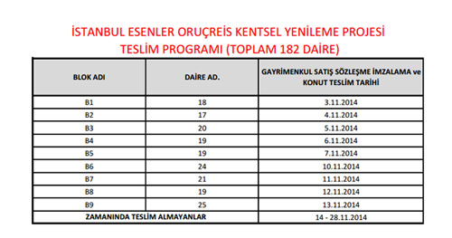 Konut teslimleri ise Esenler'deki şantiye alanında gerçekleştirlecek.