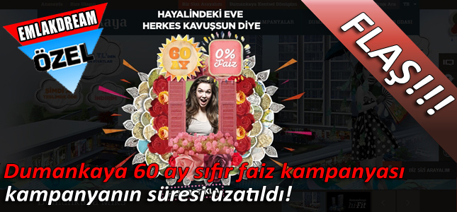 Dumankaya İnşaat’ın, daha önceki sloganı da değiştirerek “Hayalindeki eve herkes kavuşsun diye 60 ay, yüzde 0 faiz avantajımız var.” sloganıyla hayata geçirdiği kampanya, Dumankaya hi-Fit, Dumankaya Ritim İstanbul, Dumankaya Konsept Halkalı, Dumankaya Adres Natura ve Dumankaya Flex Kurtköy projelerinde geçerli olacak.