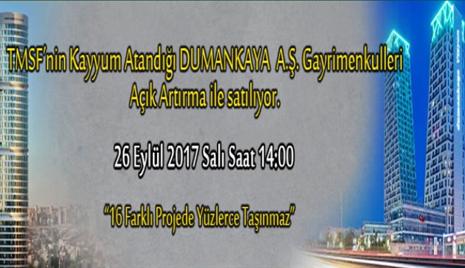 Tasarruf Mevduatı Sigorta Fonu (TMSF) tarafından yönetimine kayyum atanan Dumankaya İnşaat'ın 16 projesindeki yüzlerce konut-ofis ve ticari ünite 26 eylül salı günü saat 14.00'te Eskidji Gayrimenkul tarafından açık artırma yöntemiyle satışa çıkarılıyor. 105 bin ile 3 milyon 663 bin TL arasında değişen muhammen bedellerle satışa sunulacak gayrimenkullerle ilgili detaylı bilgi almak ve başvuruda bulunmak için Eskidji Gayrimenkul'ün www.eskidji.com internet sitesinden bilgi alabilirsiniz.