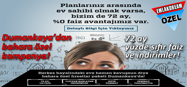 “Planlarınız arasında ev sahibi olmak varsa bizim de 72 ay yüzde sıfır faiz avantajımız var” sloganıyla hayata geçirilen kampanya, Dumankaya hi-Fit, Dumankaya Ritim İstanbul, Dumankaya Konsept Halkalı, Dumankaya Adres Natura ve Dumankaya Flex Kurtköy projelerinde geçerli olacak.