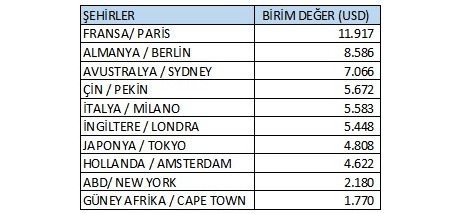 İstanbul ve dünyanın önde gelen metropollerinde 1 metrekare konut edinmenin maliyetini mercek altına altına alan Eva Gayrimenkul Değerleme Uzmanı Anıl Ünlü, dünyada şehirler arasında en yüksek birim fiyatının 11.917 USD ile Fransa’nın Paris kentinde olduğunu belirterek, Paris’in ardından Berlin ve Sydney geldiğini, araştırılan şehirlerden en düşük birim fiyata sahip olan ise Güney Afrika’nın Cape Town şehri olduğunu söyledi.