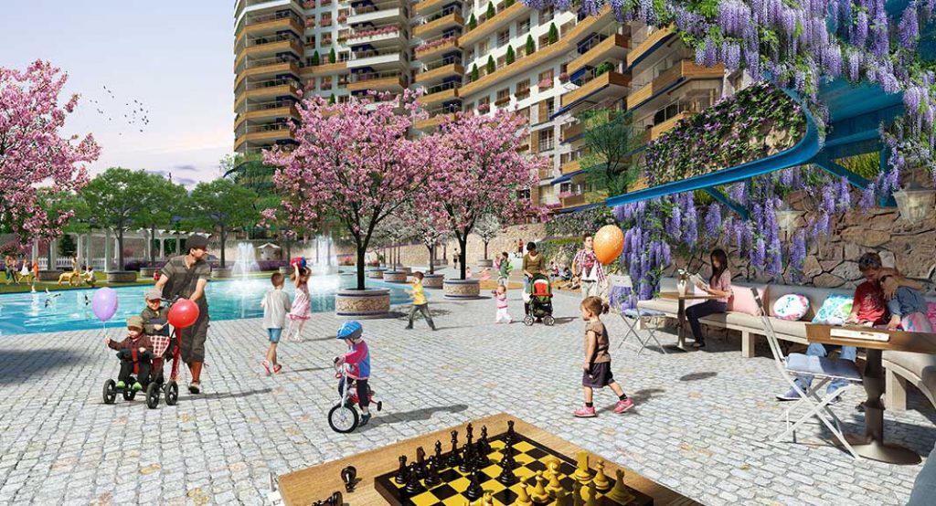 • Spor alanları, sosyal tesis alanları, açık ve kapalı otoparklar, 7/24 güvenli yaşam