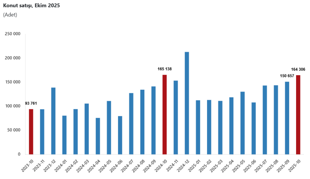 Türkiye İstatistik Kurumu (TÜİK) Ekim 2025 itibarıyla konut satış istatistiklerini açıkladı. Buna göre, geçen yılın aynı dönemine göre yüzde 0.5 puan azalan konut satış adetleri 164 bin 306 olarak kayıtlara geçti.