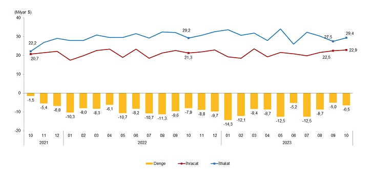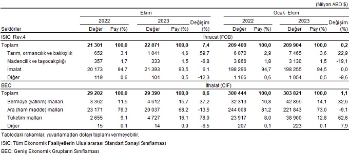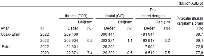Türkiye İstatistik Kurumu ile Ticaret Bakanlığı iş birliğiyle genel ticaret sistemi kapsamında üretilen geçici dış ticaret verilerine göre; ihracat 2023 yılı Ekim ayında, bir önceki yılın aynı ayına göre %7,4 artarak 22 milyar 871 milyon dolar, ithalat %0,6 artarak 29 milyar 390 milyon dolar olarak gerçekleşti.