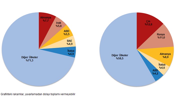 Ocak-Ekim döneminde ihracatta ilk sırayı Almanya aldı. Almanya’ya yapılan ihracat 17 milyar 666 milyon dolar olurken, bu ülkeyi sırasıyla; 12 milyar 261 milyon dolar ile ABD, 10 milyar 269 milyon dolar ile İtalya, 10 milyar 253 milyon dolar ile Irak ve 10 milyar 178 milyon dolar ile Birleşik Krallık takip etti. İlk 5 ülkeye yapılan ihracat, toplam ihracatın %28,9’unu oluşturdu.