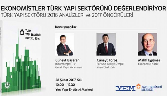 28 Şubat 2017 Salı günü ''Ekonomistler Türk Yapı Sektörünü Değerlendiriyor /Türk Yapı Sektörü 2016 Analizleri ve 2017 Öngörüleri'' konulu düzenlenecek etkinlikte Bloomberg HT Genel Yayın Yönetmeni Cüneyt Başaran, Fortune Türkiye Genel Yayın Direktörü Cüneyt Toros ve Ekonomist Mahfi Eğilmez, raporu 2017 yılına dair öngörüleriyle birlikte değerlendirecekler. Yatırımcıların, mimarların, yapı malzemesi üreticisi ve tedarikçilerinin, sektör profesyonellerinin, sektör temsilcilerinin ve basının izleyeceği etkinlikte katılımcılar sektöre dair somut öneriler elde edecekler.