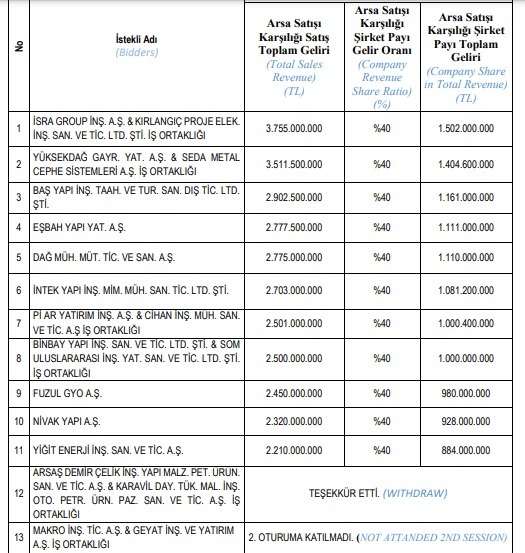 İhalenin ikinci oturumuna katılan şirket & ortaklıklar ve teklifleri şöyle: