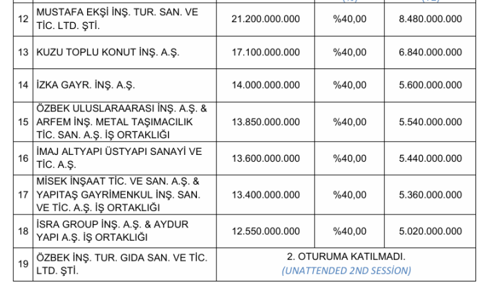 İhalede alınan en yüksek teklif şu şekildedir: