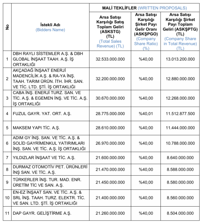 İhalede alınan en yüksek teklif şu şekildedir: