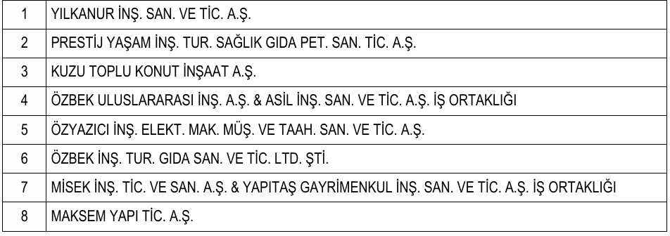 Emlak Konut GYO’nun İstanbul Esenler Atışalanı Kuzey Bölgesi 1. Etap Arsa Satışı Karşılığı Gelir Paylaşımı İşi ihalesinin 1. oturumu 15.01.2026 saat 11:00’da gerçekleştirildi. Söz konusu ihalenin ön yeterlilik aşamasına aşağıda belirtilen 8 firma katıldı.