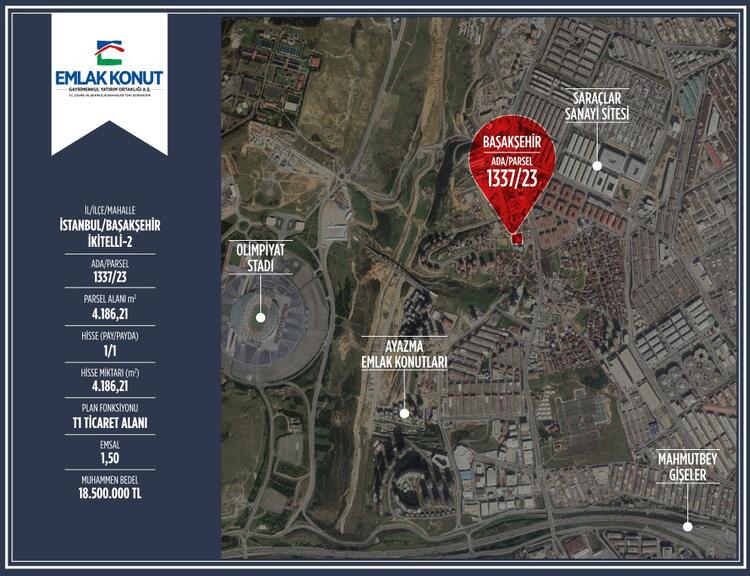 1337/23 ada ve parseldeki 4.186,21 metrekarelik ticaret alanı imarlı, 1.5 emsali olan arsanın muhammen değeri 18 milyon 500 bin TL olarak belirlendi.