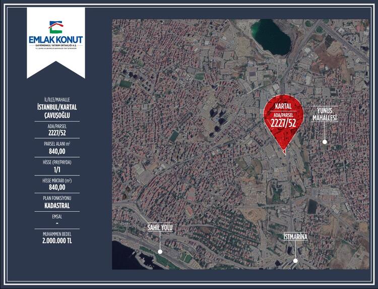 2227/52 ada ve parseldeki 840 metrekarelik kadastral imarlı arsanın muhammen değeri 2 milyon TL olarak belirlendi.