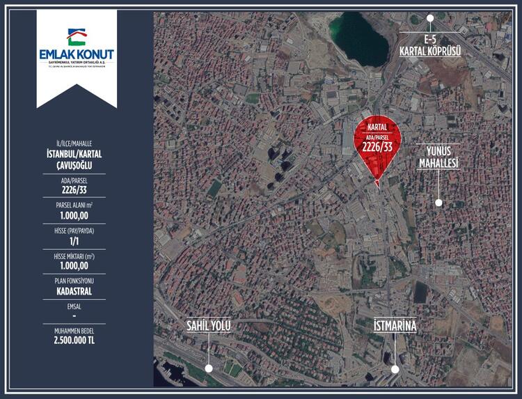 2226/33 ada ve parseldeki 1.000 metrekarelik kadastral alanı imarlı arsanın muhammen değeri 2 milyon 500 bin TL olarak belirlendi.
