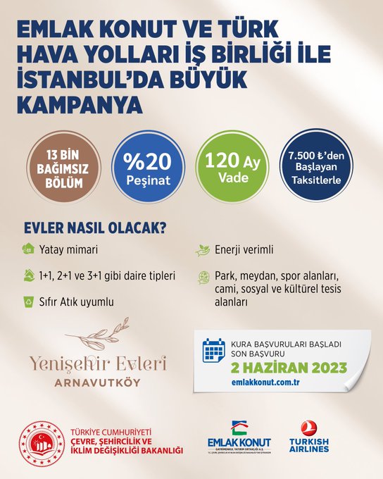 Emlak Konut ve THY iş birliğiyle İstanbul’da ilk kez ev sahibi olacaklara yeni sosyal konut müjdesi.. 2,5 milyon metrekare alan üzerinde az katlı ve yatay mimari anlayışıyla tasarlanan, 1+1, 2+1 ve 3+1 kat planında 13 bin bağımsız bölümün yer alacağı Yenişehir Evleri Arnavutköy projesi için kura başvuruları başladı. Başvurular www.emlakkonut.com.tr adresi üzerinden 2 Haziran tarihine kadar yapılabilecek.