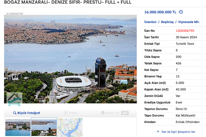 İlanlar arasında İstanbul’un Beşiktaş ilçesindeki Boğaz manzaralı, denize sıfır 200 oda, 426 yatak kapasiteli 5 yıldızlı otel 16 milyar TL’lik fiyatıyla en pahalı otel olarak dikkat çekiyor.