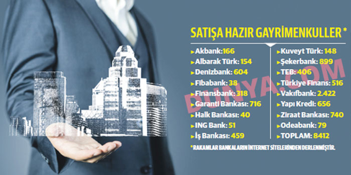 Banka ve finans kuruluşları tarafından kullanılan kredilerle satışı yapılan ancak daha sonra kredi borcu ödenmemesinden dolayı teminat olarak bu kurumların eline geçen ve satışa sunulan konut sayısı bugün itibarıyla bu kuruluşların internet sitesinde yer alan satış ilanlarıyla birlikte 8 bin 412 adedi bulmuş durumda ve bu adedin de değerlemesi tamamlandıktan sonra yeni satışa sunulacak gayrimenkullerle birlikte 10 bini geçeceği söyleniyor. Bazı bankaların ellerindeki konut sayısını kamuoyuyla tam olarak paylaşmayı istememesinden dolayı bu adetlerin çok daha yukarılarda olduğu da finans çevrelerinde konuşuluyor. Bankalar içinde en çok bu şekilde konutu satışa çıkaran banka ise 2.422 adet ile Vakıfbank oldu.
