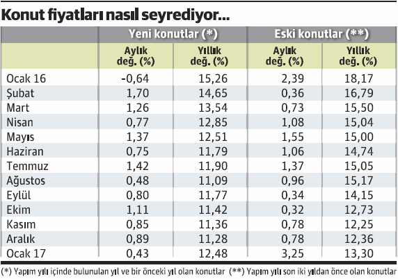 Yeni konutların fiyatı ocak ayında yüzde 0.43 artarken, yapım yılı son iki yıldan önce olan "eski konutlar" olarak tanımlanan konutların fiyatında ocak ayında tam yüzde 3.25 artış oldu. Eski konutların fiyatı geçen yılın ocak ayında da yüzde 2.39 gibi yüksek bir oranda artmıştı.