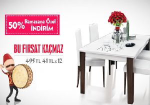 Evgör Mobilya’nın Ramazan ayına özel gerçekleştirdiği ve artık geleneksel hale gelen %50 indirim fırsatı başladı. Kampanya ile Duygu Modern Yemek Masası Takımı, 990 TL yerine 495 TL’den satışa sunuluyor. İftarda misafirlerini yeni yemek masalarında ağırlamak isteyenler, Evgör Mobilya’nın geleneksel Ramazan kampanyasından Bayram’a kadar yararlanabilecek. www.evgor.com.tr adresinden de sipariş verilebilen indirimli yemek masası takımında, ayrıca vade farksız 12 aya varan taksit seçeneği bulunuyor.