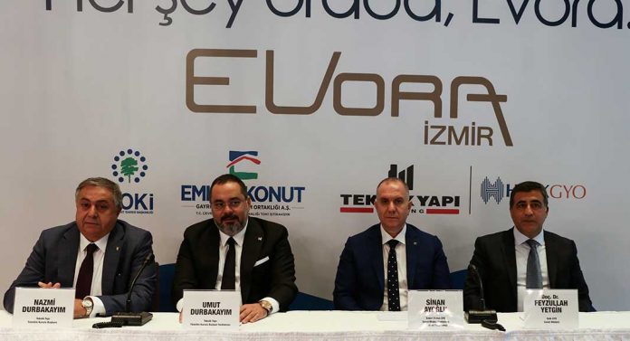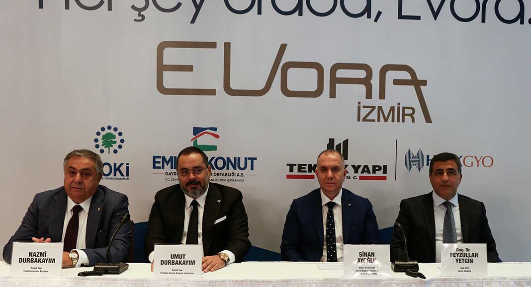 Emlak Konut GYO İhale ve Pazarlamadan sorumlu Genel Müdür Yardımcısı Sinan Ayoğlu, Halk GYO Genel Müdürü Dr. Feyzullah Yetgin, Teknik Yapı Yönetim Kurulu Başkanı Nazmi Durbakayım ve Başkan Yardımcısı Umut Durbakayım ev sahipliğinde 25 eylül 2018 tarihinde düzenlenen basın toplantısıyla kamuoyuna ve yatırımcılara tanıtılan Evora İzmir projesi; 1+1’den 6+1’e kadar değişen kat planlarında 1049 konuttan, 35 ticari mağazadan, 121 oda kapasiteli bir otelden, 500 kişilik balo salonundan, 485 kişilik konferans salonundan, bir sanat galerisinden ve toplam 12 bin metrekarelik büyüklükte 2 adet parktan meydana gelecek.
