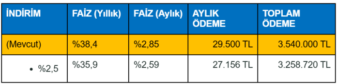 Güncel faiz kararı ile birlikte yıllık faiz oranında yüzde 2,5 indirimin olacağını kabul edersek 120 ay vadeli ödeme planı ile 1 milyon liralık konut kredisi için yıllık yüzde 35,9’luk faiz oranı ile aylık 27.156 TL, toplamda ise 3.258.720 TL ödeyecek.