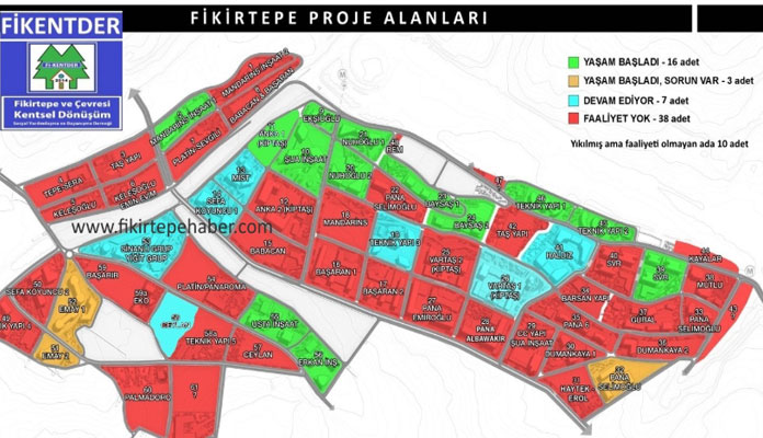 Dernek tarafından Twitter üzerinden yapılan paylaşımda, Fikirtepe’de tamamlanan ve yaşamın başladığı 16 proje, tamamlanıp yaşamın başladığı ama birtakım sorunların halen devam ettiği 3 proje, inşaat çalışmalarının devam ettiği 7 proje ve yıkımları tamamlanmasına karşın henüz hiç bir faaliyetin başlamadığı 38 proje olduğu belirtiliyor.