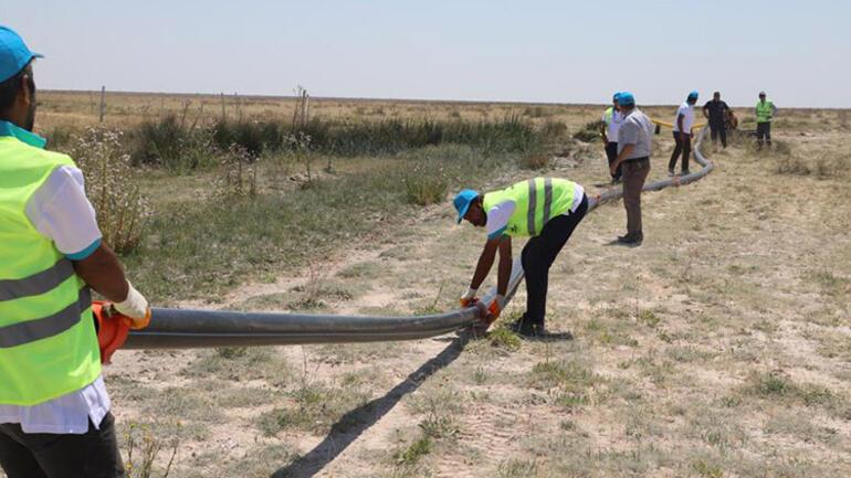 Bilim insanlarının da görüşünü alan Bakanlık, bölgeye yakın Gölyazı Mahallesi’ndeki su kaynağından 4 kilometrelik borular döşeyerek flamingolara can suyu aktarımına başladı.