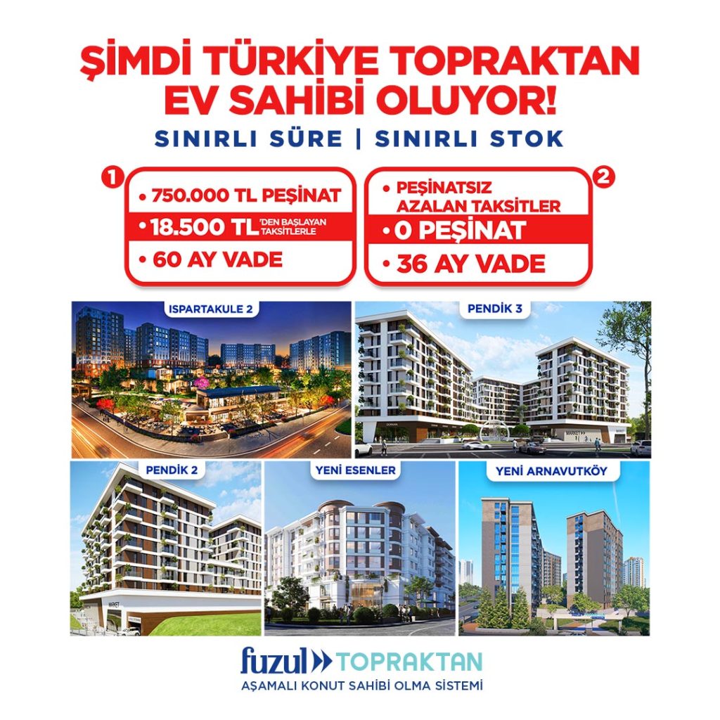 Konut sahibi olmanın giderek zorlaştığı günümüzde, orta ve dar gelirli vatandaşların konuta erişimini kolaylaştırmak amacıyla harekete geçen Fuzul Topraktan, konut edinimini destekleyecek iki yeni kampanyayı hayata geçirdi. “Şimdi Türkiye Topraktan Ev Sahibi Oluyor” sloganıyla hayata geçirilen kampanya, yüksek getiri potansiyeline sahip olan Yeni Arnavutköy, Pendik 2, Pendik 3, Yeni Esenler ve Ispartakule 2 projelerinde geçerli olacak.