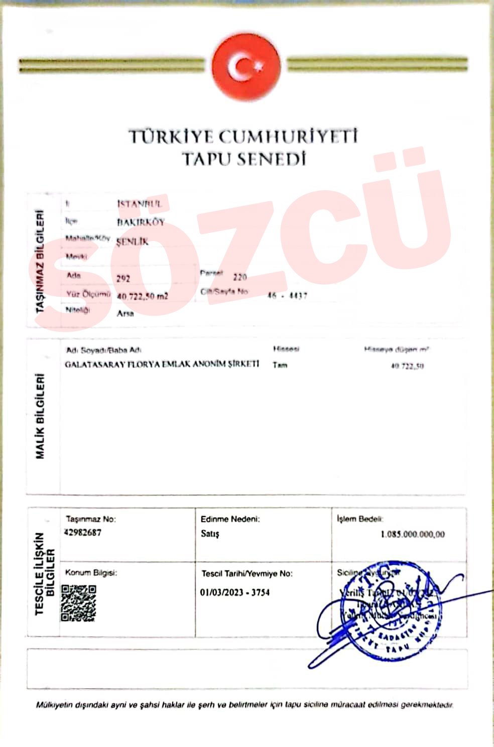 Alım-satım işlemi ‘Galatasaray Florya Emlak’ unvanlı anonim şirket üzerinden yapılırken arsanın tapusu da sarı-kırmızılı kulübe ulaştı.