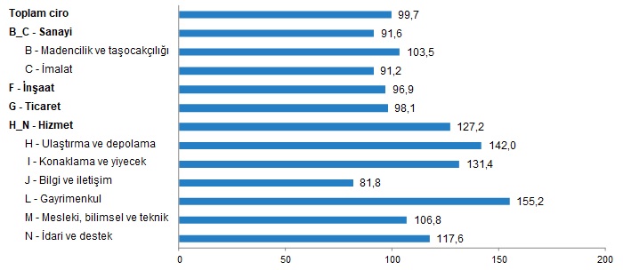 Türkiye İstatistik Kurumu (TÜİK), Kasım 2022 itibarıyla; sanayi, inşaat, ticaret ve hizmet sektörleri Ciro Endeksleri verilerini açıkladı. Buna göre, ortalamada yıllık bazda endeks yüzde 99.7 olurken endeksin alt kırılımlarından Hizmet sektörü altında yer alan Gayrimenkul sektöründe son 12 aylık ciro artışı yüzde 155.2 oldu. Bu artış oranı inşaat sektöründe ise yüzde 96.9 olarak gerçekleşti.