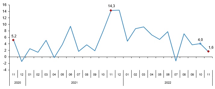 Ciro endeksleri aylık değişim oranları (%), Kasım 2022