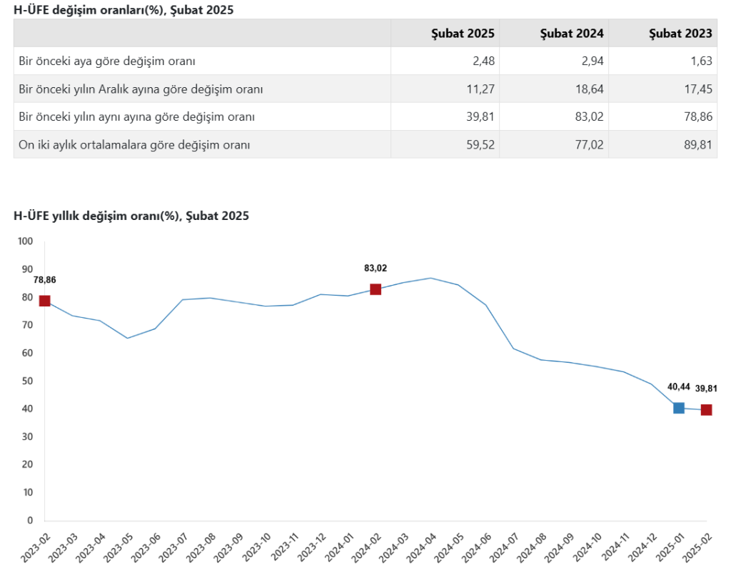 H-ÜFE 2025 yılı Şubat ayında bir önceki aya göre %2,48 artış, bir önceki yılın Aralık ayına göre %11,27 artış, bir önceki yılın aynı ayına göre %39,81 artış ve on iki aylık ortalamalara göre %59,52 artış gösterdi.