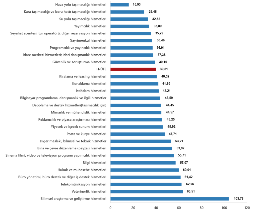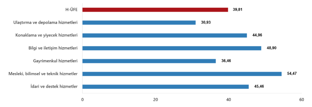 Bir önceki yılın aynı ayına göre, ulaştırma ve depolama hizmetlerinde %30,93 artış, konaklama ve yiyecek hizmetlerinde %44,96 artış, bilgi ve iletişim hizmetlerinde %48,90 artış, gayrimenkul hizmetlerinde %36,46 artış, mesleki, bilimsel ve teknik hizmetlerde %54,47 artış, idari ve destek hizmetlerde %45,46 artış gerçekleşti.