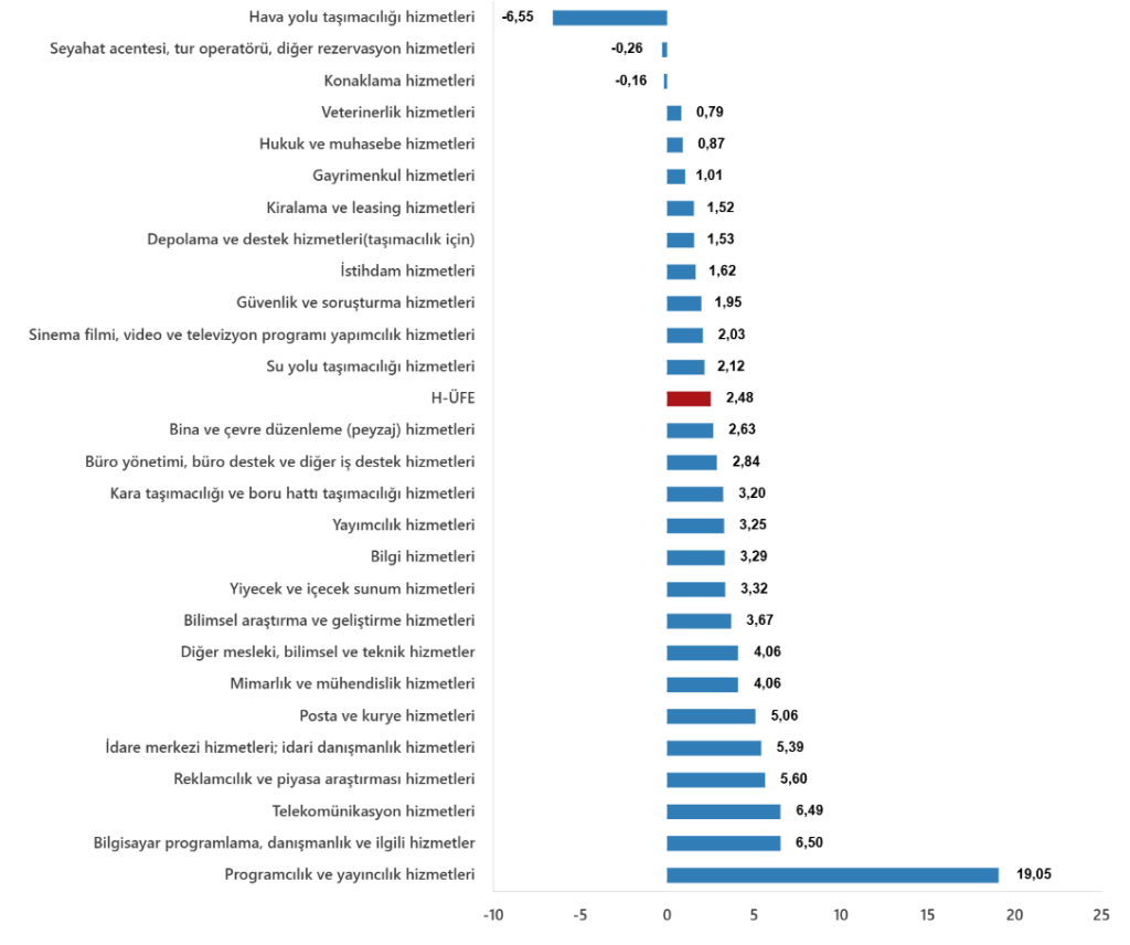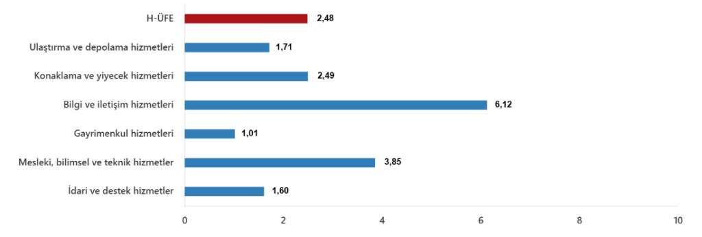 Bir önceki aya göre, ulaştırma ve depolama hizmetlerinde %1,71 artış, konaklama ve yiyecek hizmetlerinde %2,49 artış, bilgi ve iletişim hizmetlerinde %6,12 artış, gayrimenkul hizmetlerinde %1,01 artış, mesleki, bilimsel ve teknik hizmetlerde %3,85 artış, idari ve destek hizmetlerde %1,60 artış gerçekleşti.
