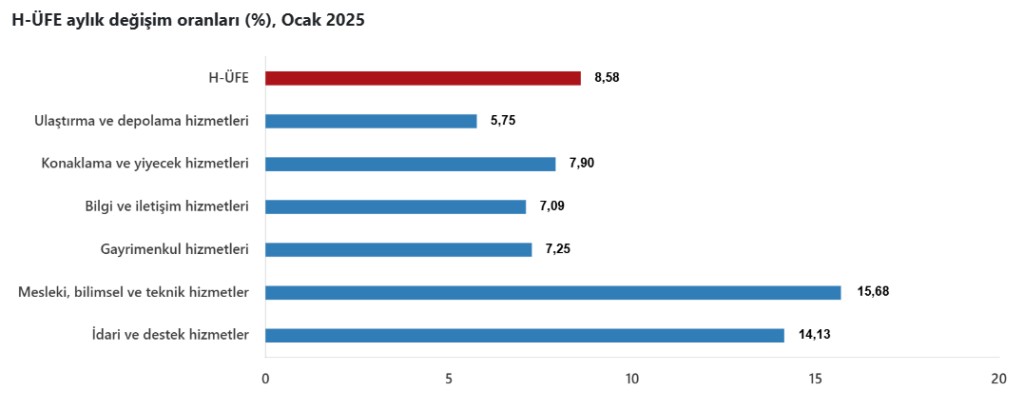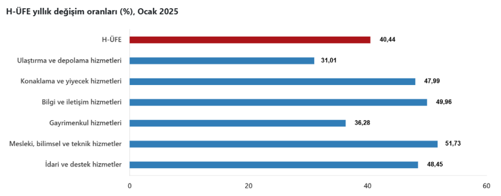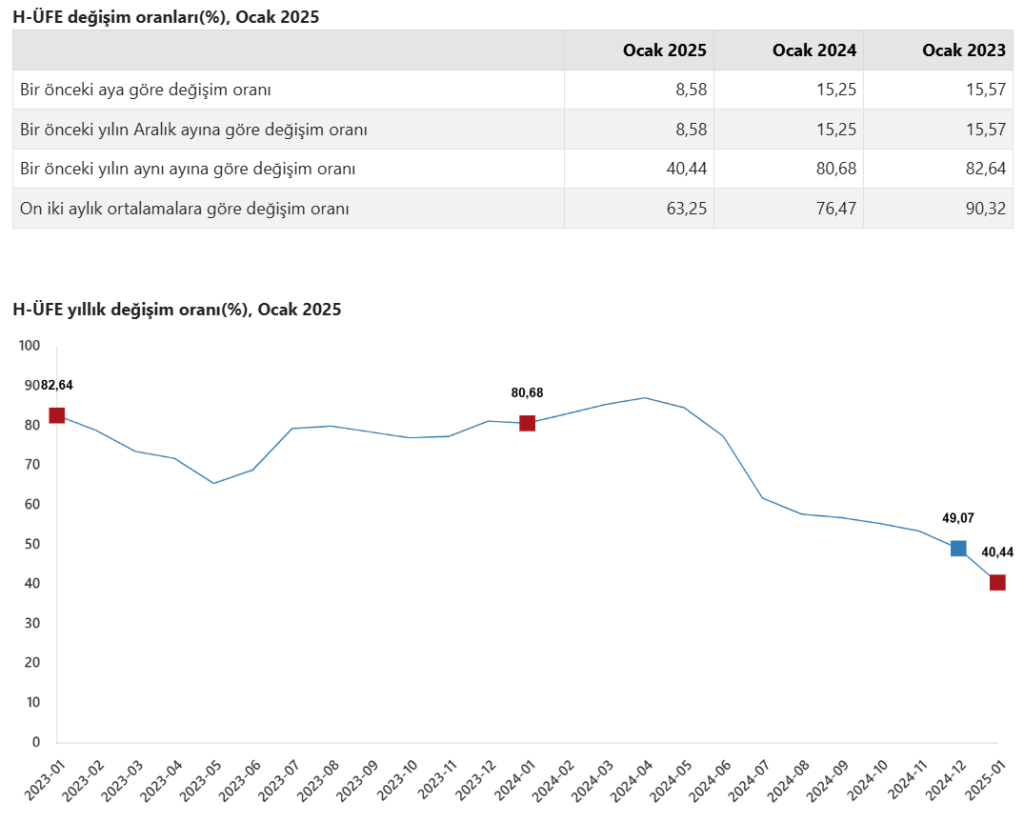 H-ÜFE 2025 yılı Ocak ayında bir önceki aya göre %8,58 artış, bir önceki yılın Aralık ayına göre %8,58 artış, bir önceki yılın aynı ayına göre %40,44 artış ve on iki aylık ortalamalara göre %63,25 artış gösterdi.