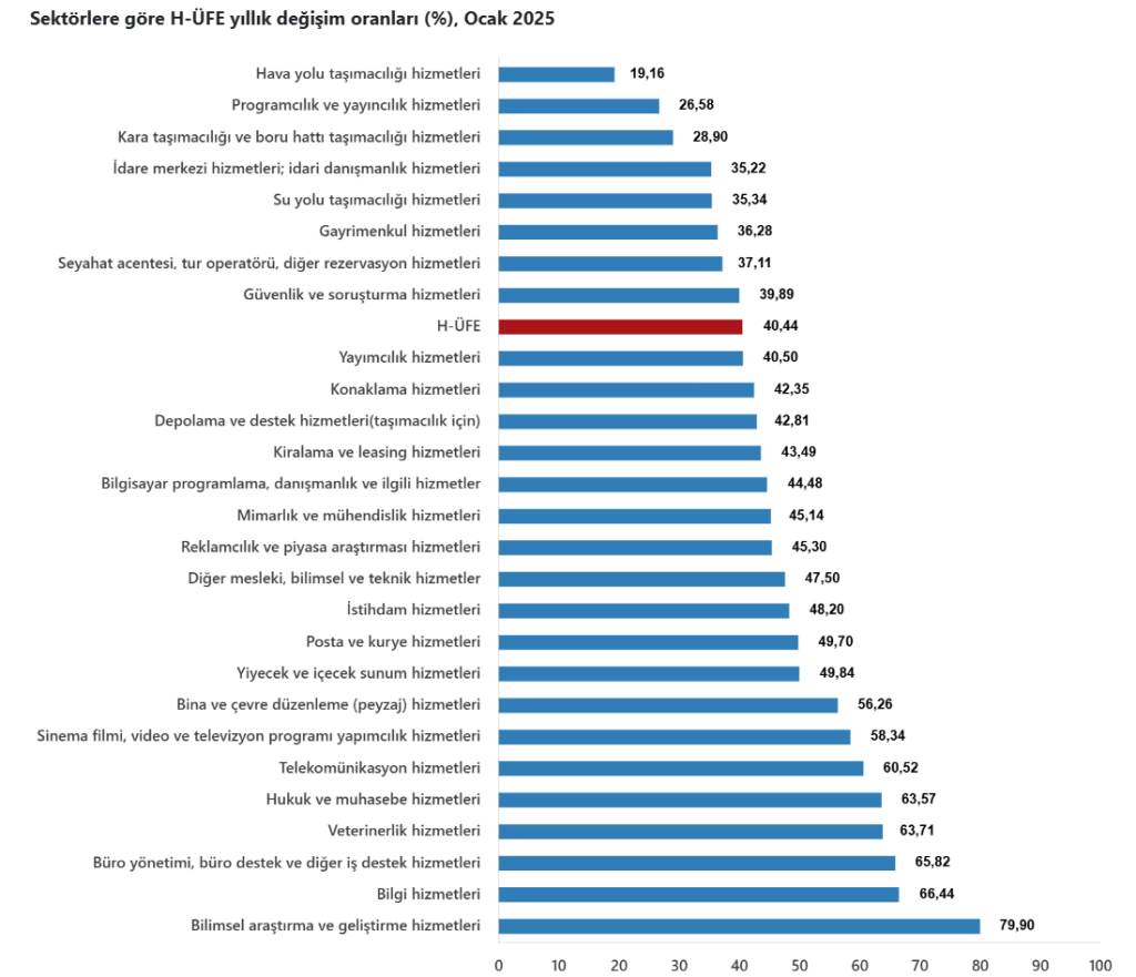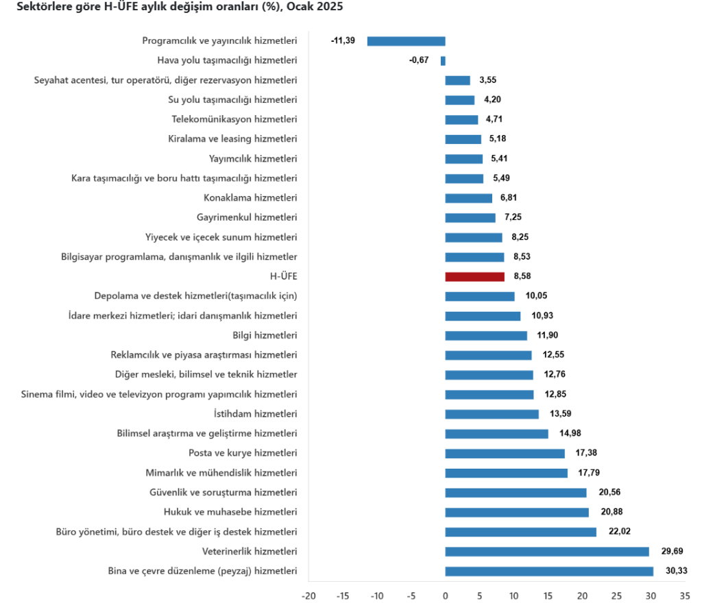 Bir önceki aya göre, ulaştırma ve depolama hizmetlerinde %5,75 artış, konaklama ve yiyecek hizmetlerinde %7,90 artış, bilgi ve iletişim hizmetlerinde %7,09 artış, gayrimenkul hizmetlerinde %7,25 artış, mesleki, bilimsel ve teknik hizmetlerde %15,68 artış, idari ve destek hizmetlerde %14,13 artış gerçekleşti.