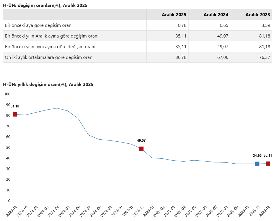 H-ÜFE 2025 yılı Aralık ayında bir önceki aya göre %0,78 artış, bir önceki yılın Aralık ayına göre %35,11 artış, bir önceki yılın aynı ayına göre %35,11 artış ve on iki aylık ortalamalara göre %36,78 artış gösterdi.