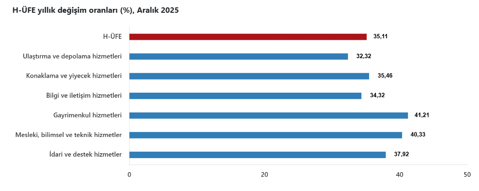 Türkiye İstatistik Kurumu (TÜİK) Aralık 2025 itibarıyla Hizmet Üretici Fiyat Endeksi (H-ÜFE) verilerini açıkladı. Buna göre, H-ÜFE’deki yıllık artış %35.11 olurken bu oran endeksin alt kırılımlarından inşaat sektöründe %41.21 olarak gerçekleşti.