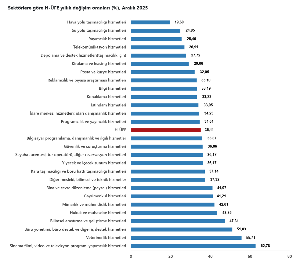 Hizmet Üretici Fiyat Endeksi (H-ÜFE) yıllık %35.11 arttı, aylık %0.78 arttı