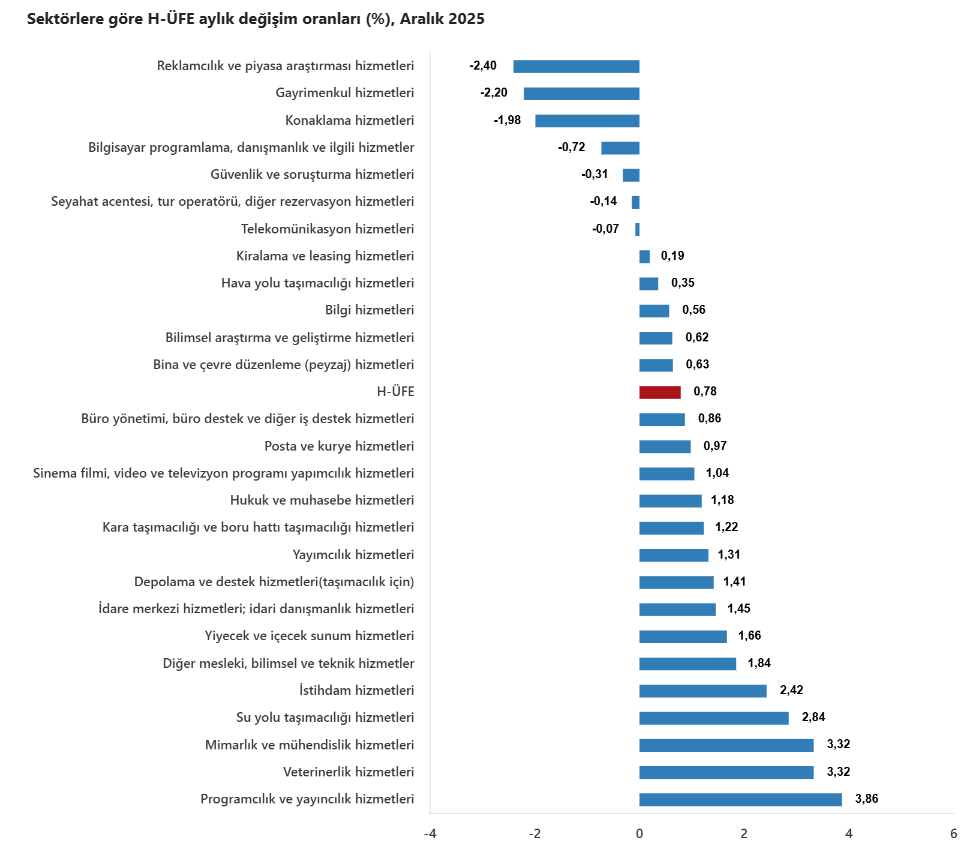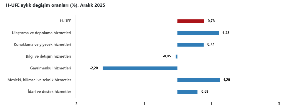 Bir önceki aya göre, ulaştırma ve depolama hizmetlerinde %1,23 artış, konaklama ve yiyecek hizmetlerinde %0,77 artış, bilgi ve iletişim hizmetlerinde %0,05 azalış, gayrimenkul hizmetlerinde %2,20 azalış, mesleki, bilimsel ve teknik hizmetlerde %1,25 artış, idari ve destek hizmetlerde %0,59 artış gerçekleşti.