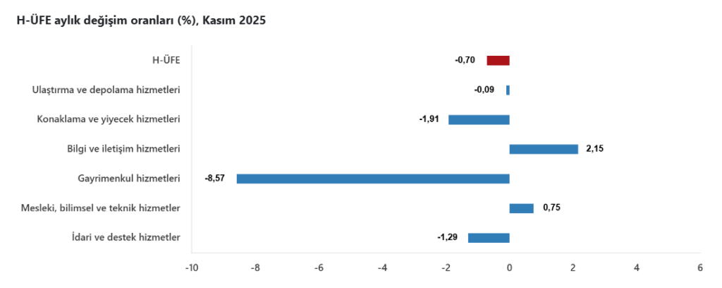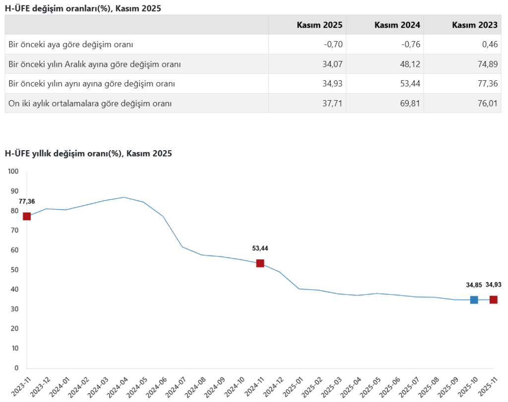 H-ÜFE 2025 yılı Kasım ayında bir önceki aya göre %0,70 azalış, bir önceki yılın Aralık ayına göre %34,07 artış, bir önceki yılın aynı ayına göre %34,93 artış ve on iki aylık ortalamalara göre %37,71 artış gösterdi.