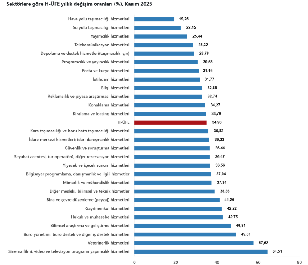 Bir önceki yılın aynı ayına göre, ulaştırma ve depolama hizmetlerinde %31,51 artış, konaklama ve yiyecek hizmetlerinde %36,00 artış, bilgi ve iletişim hizmetlerinde %35,19 artış, gayrimenkul hizmetlerinde %42,22 artış, mesleki, bilimsel ve teknik hizmetlerde %39,35 artış, idari ve destek hizmetlerde %38,49 artış gerçekleşti.