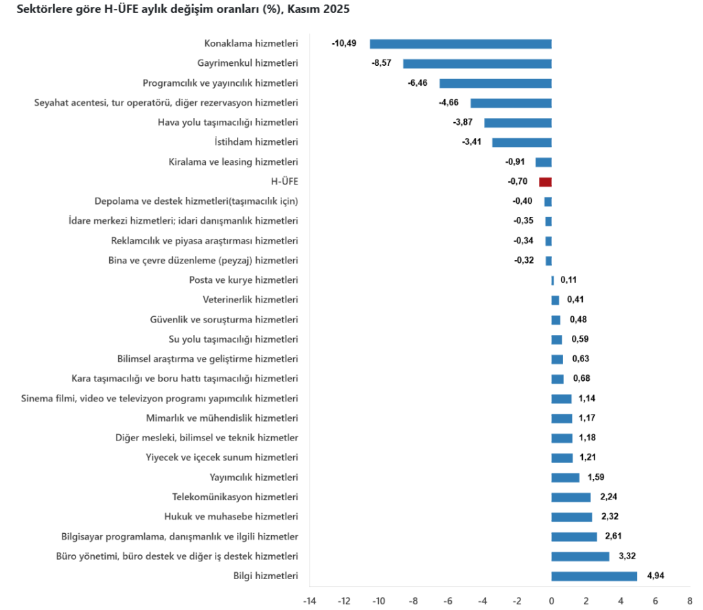 Bir önceki aya göre, ulaştırma ve depolama hizmetlerinde %0,09 azalış, konaklama ve yiyecek hizmetlerinde %1,91 azalış, bilgi ve iletişim hizmetlerinde %2,15 artış, gayrimenkul hizmetlerinde %8,57 azalış, mesleki, bilimsel ve teknik hizmetlerde %0,75 artış, idari ve destek hizmetlerde %1,29 azalış gerçekleşti.