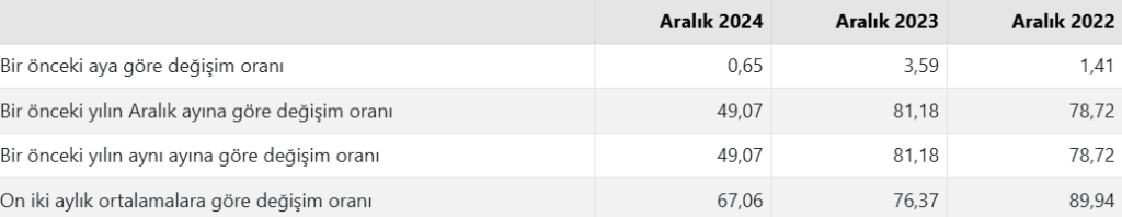H-ÜFE 2024 yılı Aralık ayında bir önceki aya göre %0,65 artış, bir önceki yılın Aralık ayına göre %49,07 artış, bir önceki yılın aynı ayına göre %49,07 artış ve on iki aylık ortalamalara göre %67,06 artış gösterdi.