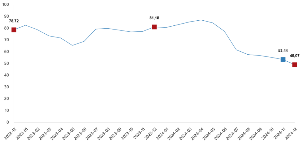 Türkiye İstatistik Kurumu (TÜİK) Aralık 2024 tarihi itibarıyla Hizmet Üretici Fiyat Endeksi (H-ÜFE) verilerini açıkladı. Buna göre, H-ÜFE yıllık artış %49.07 olurken bu oran endeksin alt kırılımlarından gayrimenkul sektöründe yıllık %47.82 olarak ortalamanın altında gerçekleşti.