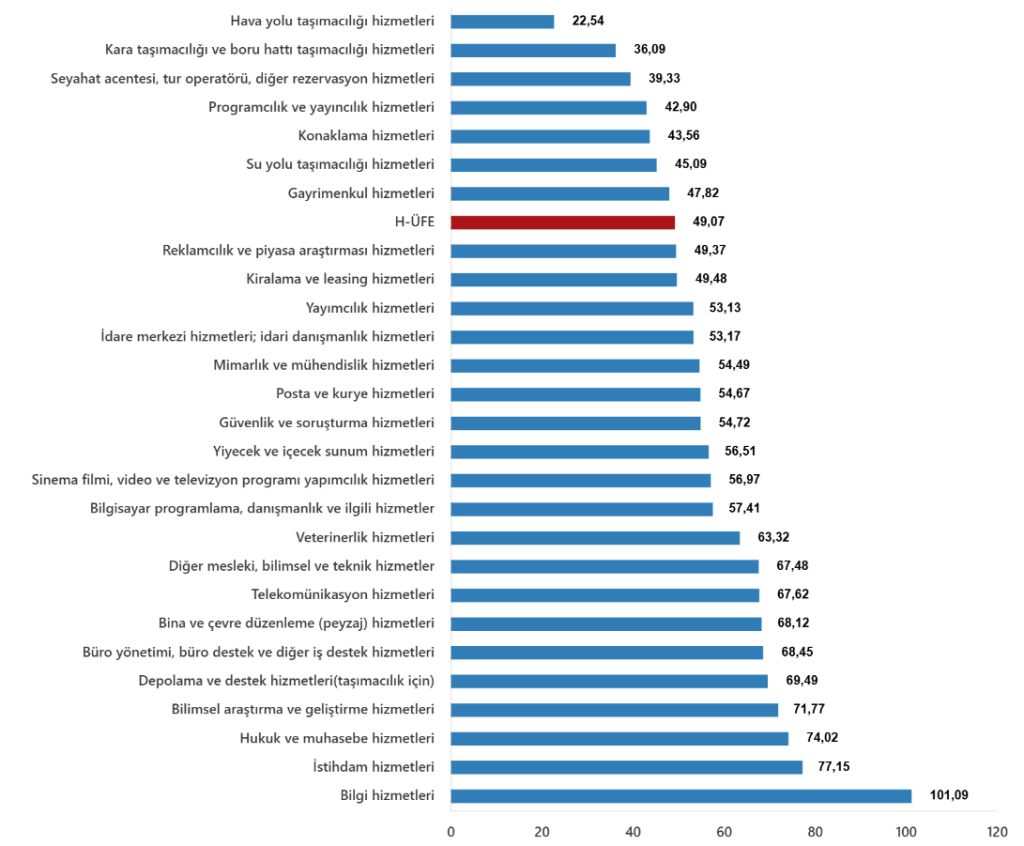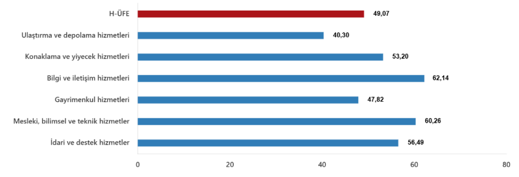 Bir önceki yılın aynı ayına göre, ulaştırma ve depolama hizmetlerinde %40,30 artış, konaklama ve yiyecek hizmetlerinde %53,20 artış, bilgi ve iletişim hizmetlerinde %62,14 artış, gayrimenkul hizmetlerinde %47,82 artış, mesleki, bilimsel ve teknik hizmetlerde %60,26 artış, idari ve destek hizmetlerde %56,49 artış gerçekleşti.