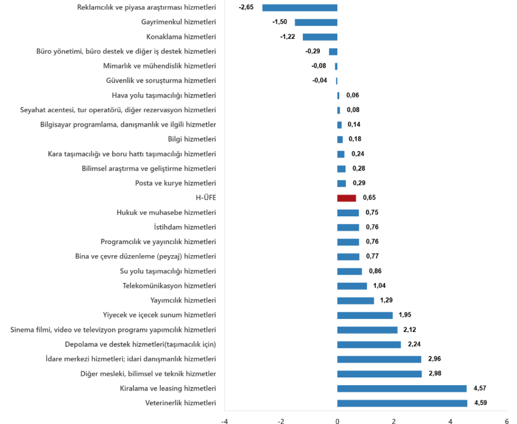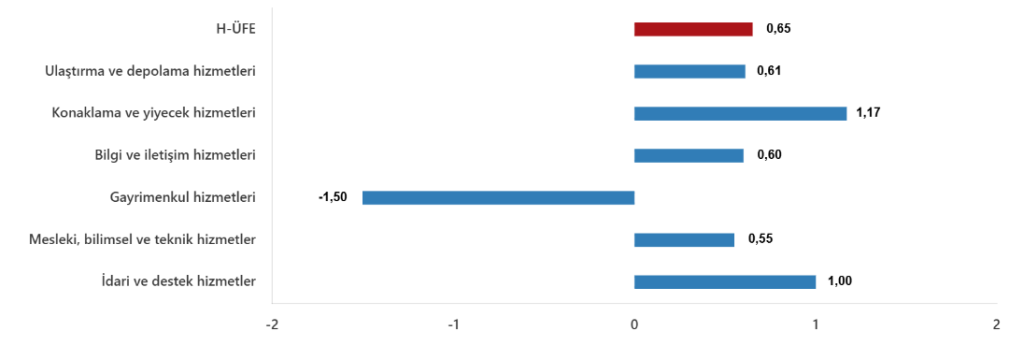 Bir önceki aya göre, ulaştırma ve depolama hizmetlerinde %0,61 artış, konaklama ve yiyecek hizmetlerinde %1,17 artış, bilgi ve iletişim hizmetlerinde %0,60 artış, gayrimenkul hizmetlerinde %1,50 azalış, mesleki, bilimsel ve teknik hizmetlerde %0,55 artış, idari ve destek hizmetlerde %1,0 artış gerçekleşti.