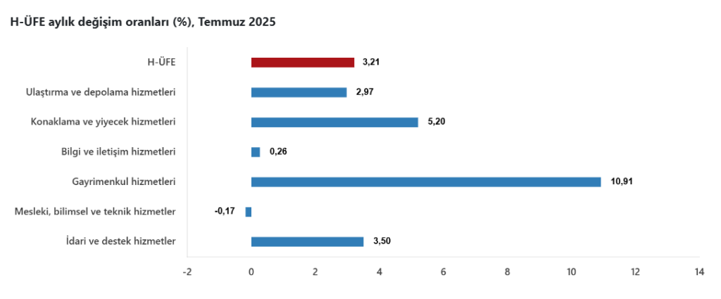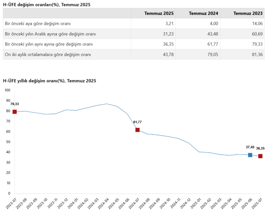 H-ÜFE 2025 yılı Temmuz ayında bir önceki aya göre %3,21 artış, bir önceki yılın Aralık ayına göre %31,23 artış, bir önceki yılın aynı ayına göre %36,35 artış ve on iki aylık ortalamalara göre %43,78 artış gösterdi.