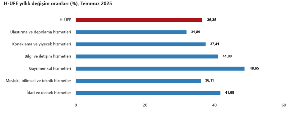Türkiye İstatistik Kurumu (TÜİK) Temmuz ayı itibarıyla Hizmet Üretici Fiyat Endeksi (H-ÜFE) verilerini açıkladı. Buna göre H-ÜFE, yıllık yüzde 36.35 artarken bu oran endeksin alt kırılımlarından gayrimenkul sektöründe yüzde 48.65 olarak gerçekleşti.