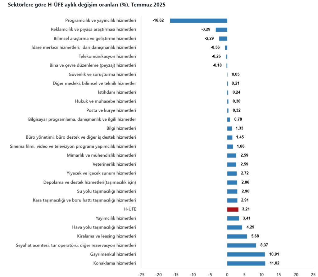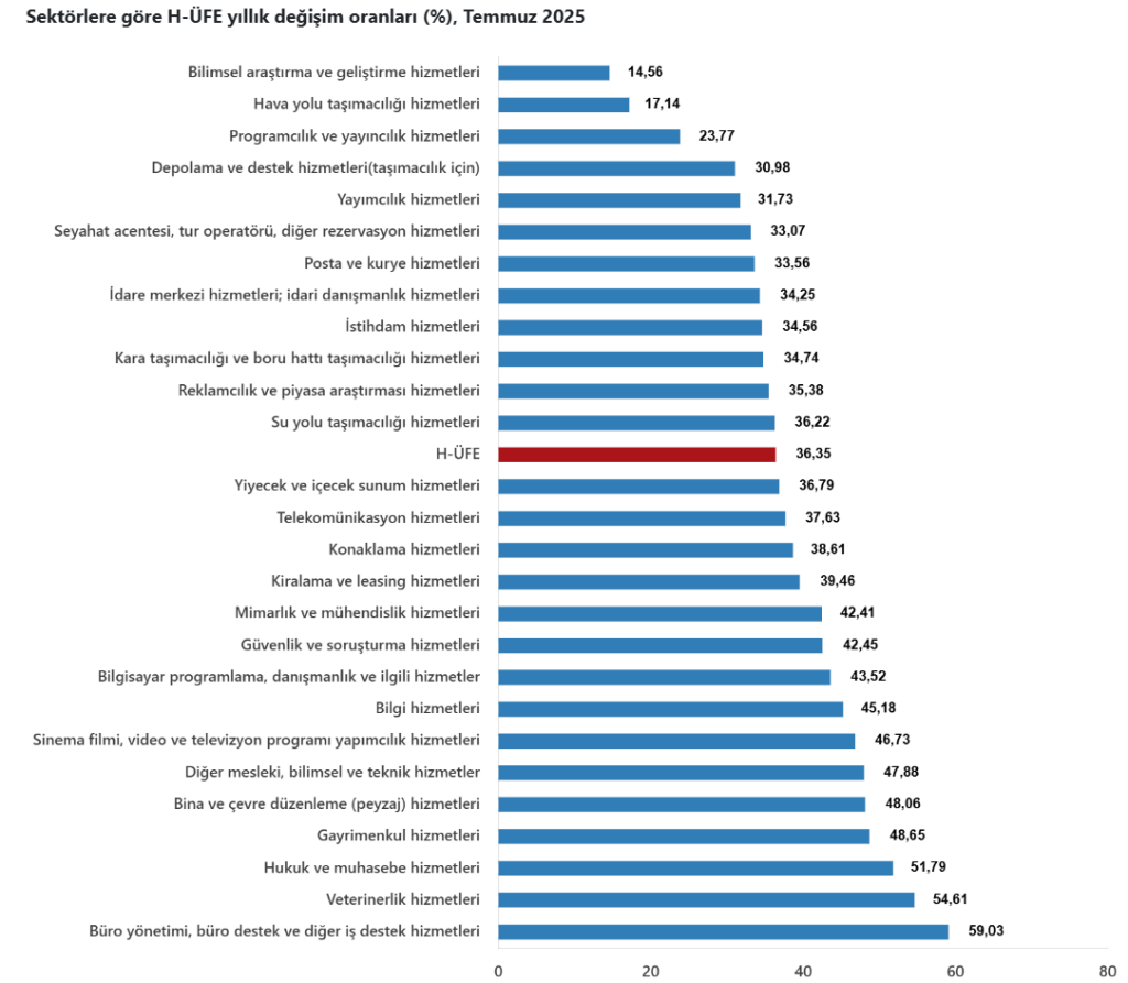 Bir önceki yılın aynı ayına göre, ulaştırma ve depolama hizmetlerinde %31,89 artış, konaklama ve yiyecek hizmetlerinde %37,41 artış, bilgi ve iletişim hizmetlerinde %41,00 artış, gayrimenkul hizmetlerinde %48,65 artış, mesleki, bilimsel ve teknik hizmetlerde %36,11 artış, idari ve destek hizmetlerde %41,68 artış gerçekleşti.