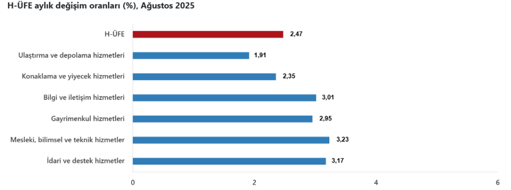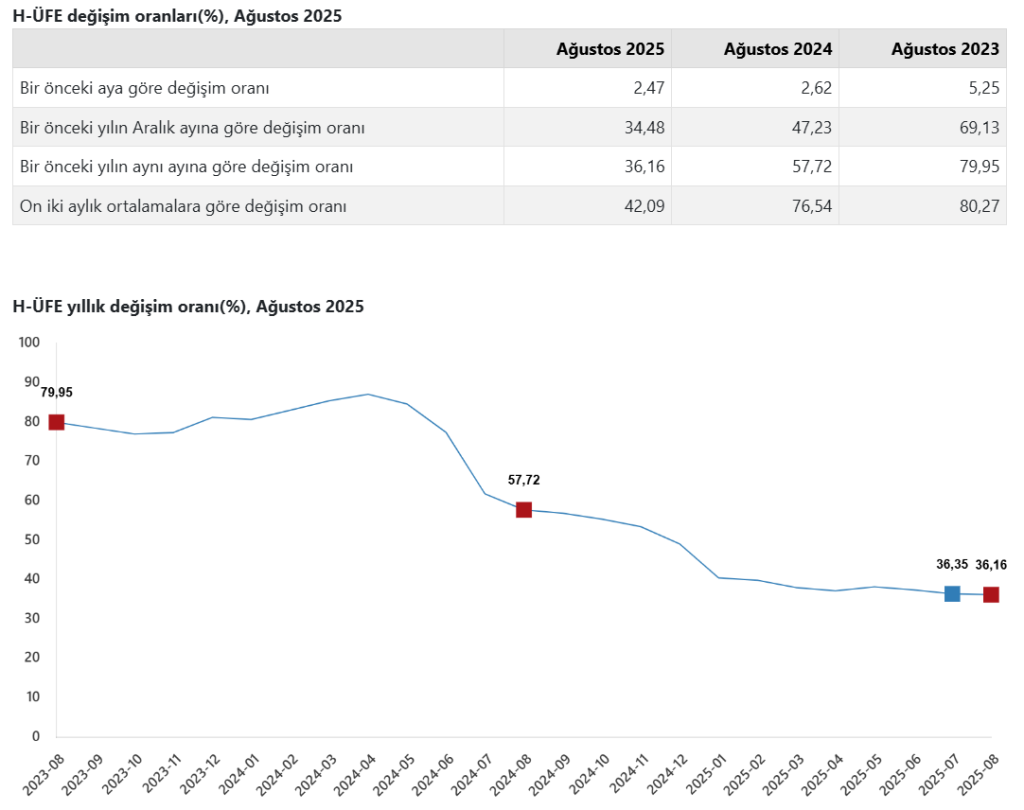 H-ÜFE 2025 yılı Ağustos ayında bir önceki aya göre %2,47 artış, bir önceki yılın Aralık ayına göre %34,48 artış, bir önceki yılın aynı ayına göre %36,16 artış ve on iki aylık ortalamalara göre %42,09 artış gösterdi.